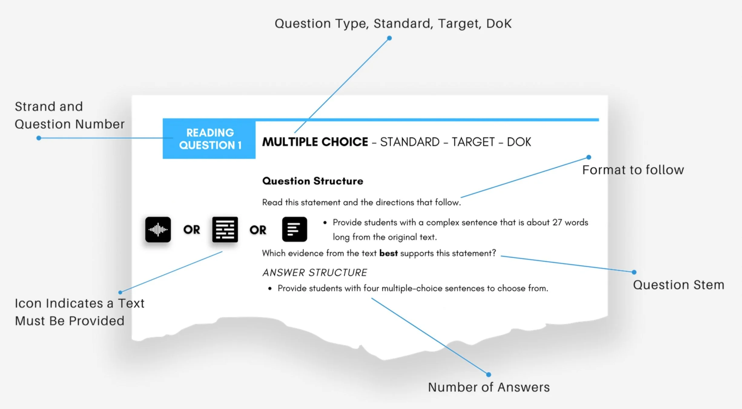 The main section of this document will walk educators through all 25 questions of the sample assessment offered by Smart Balance. Educators will see how each question uses standards, targets, and DoK. Educators will get a question steam to help them create questions and provide grade-appropriate texts for students.