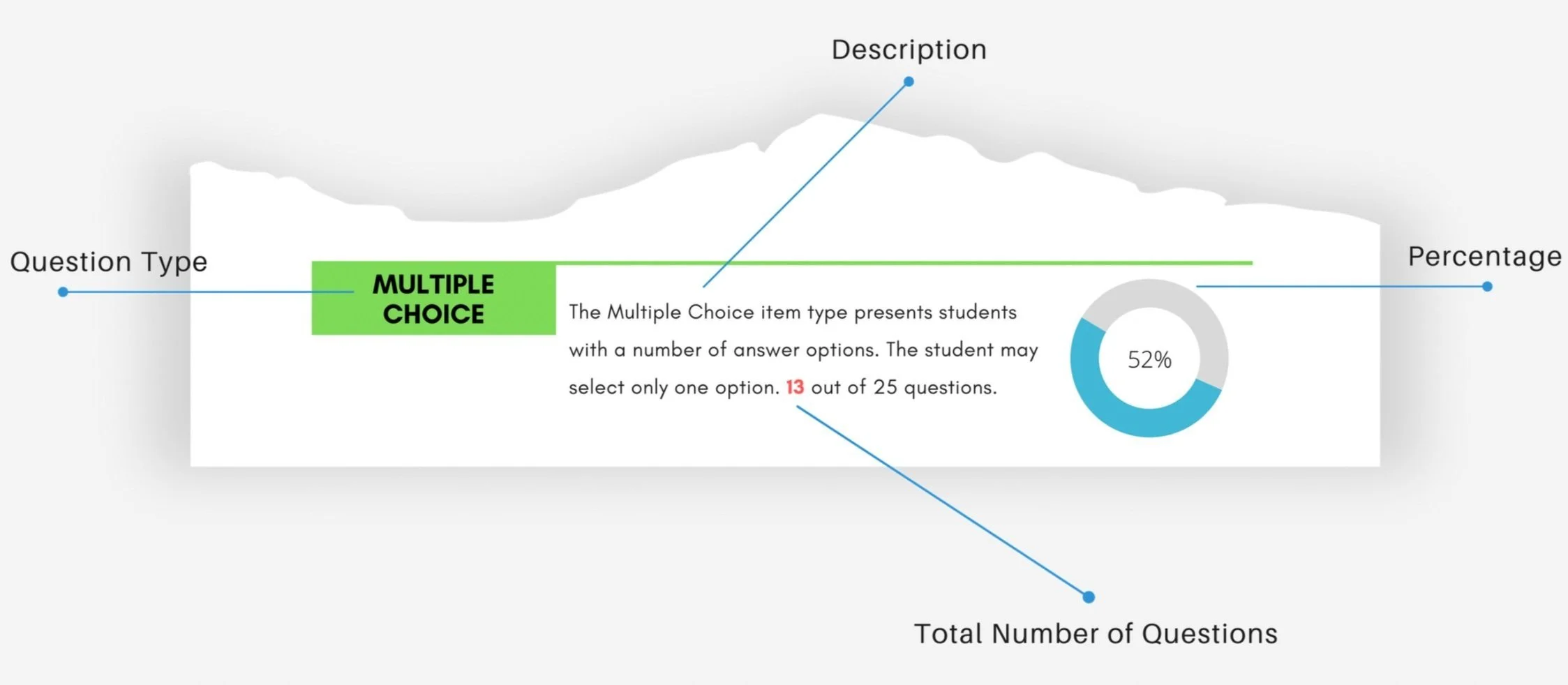 The Multiple Choice item type presents students with a number of answer options. The student may select only one option. 13 out of 25 questions.