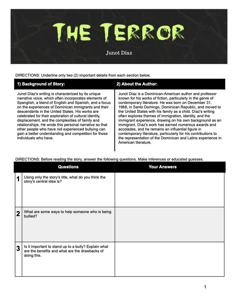 For the following six Reading Questions (RQ) students are given a single literary text to read. Educators can find a similar text to assign to students. Click HERE for the sample text.