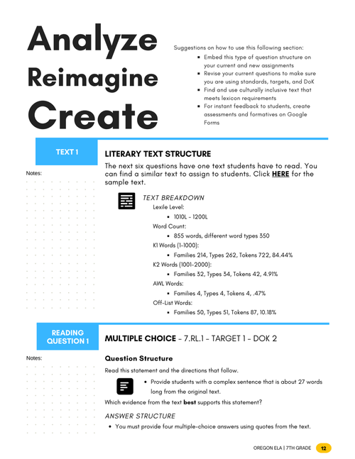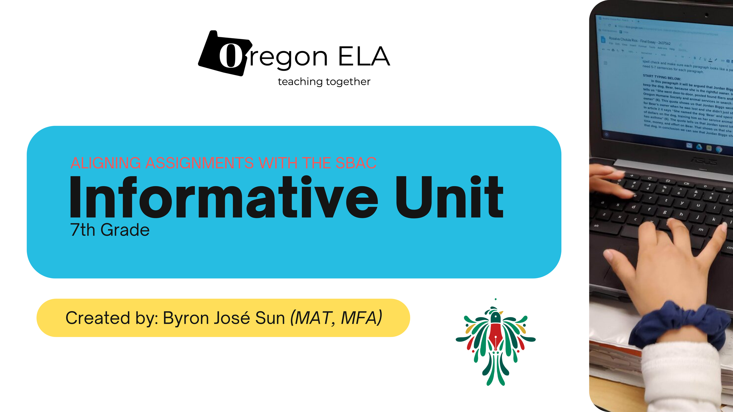 The Oregon 7th-grade Smarter Balanced Assessment (SBAC) is a tool that provides educators with data to prepare students for success in the classroom. However, it is a multilayered tool that cannot be deconstructed and studied easily. Suppose an educator can engage and interact with how the SBAC questions are structured. In that case, they can reproduce it to create rigorous scaffolded instruction that builds transferable knowledge with culturally responsive and student-centered assignments. This document aims to help educators backward design from how questions are structured in the SBAC to modifying existing curricula but, more specifically, the questions presented to students. The end goal is to help educators better prepare students for success in the classroom and standardized tests.