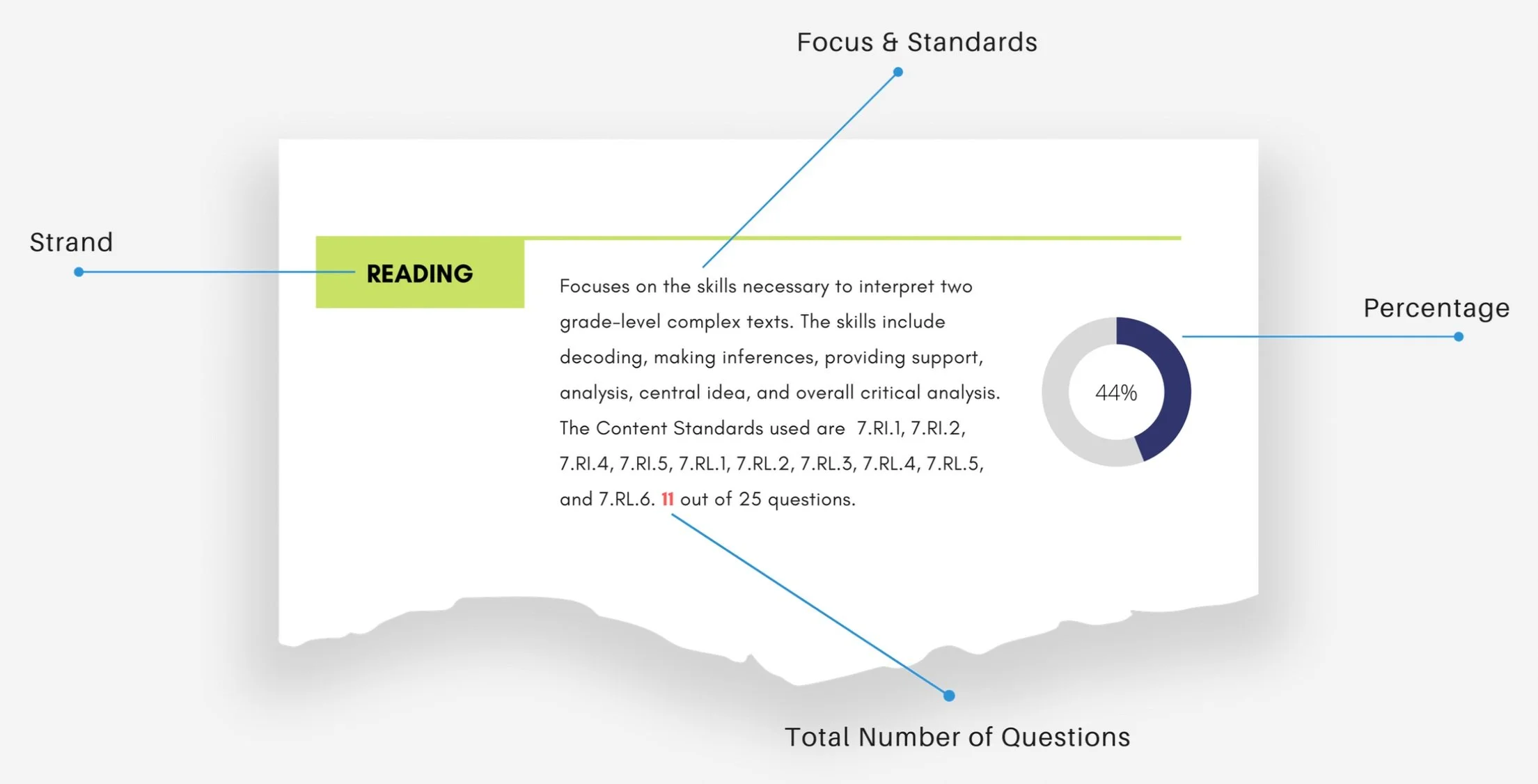 This section aims to provide educators with a glance at how the SBAC is organized into the language skills of Reading, Writing, Listening, and Research/Inquiry. The SBAC then uses a specific standard, target, depth of knowledge (DoK), and question type for every question used in these strands. Educators also see the percentage each strand makes up and the number of questions in the assessment. Understanding this structure makes it easier for educators to modify existing curricula and see what and how state standards are used.